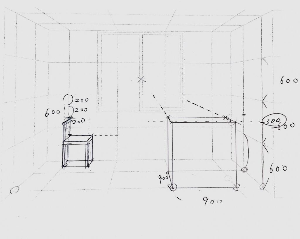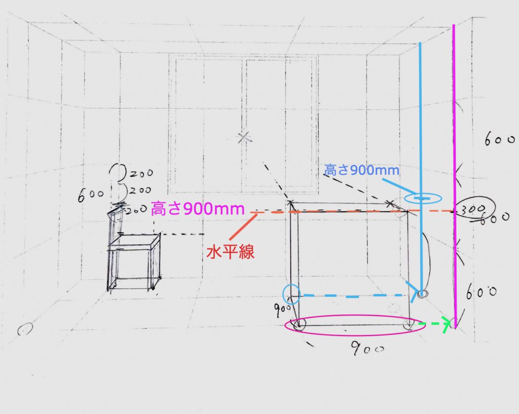 そして、壁で900mmがとれたら、そこから立方体のある方へ「水平線」を引いてみましょう。