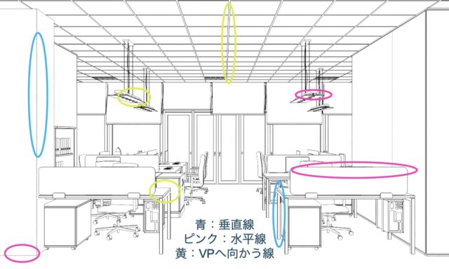 写真の本棚に収められた本であったり、細かいものでも「高さを表現するもの」は全てこの「垂直線」で表現します