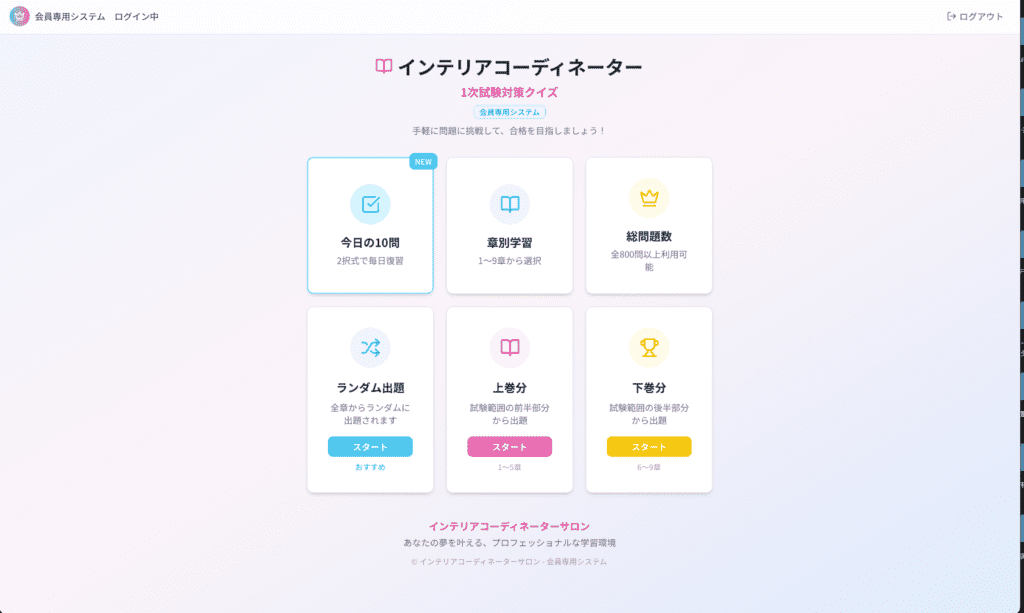 出題は「今日の10問(2択式)」「章別学習」「(全範囲からの)ランダム出題」「上巻分」「下巻分」などとご自身のスタイルに合った学習が可能です!