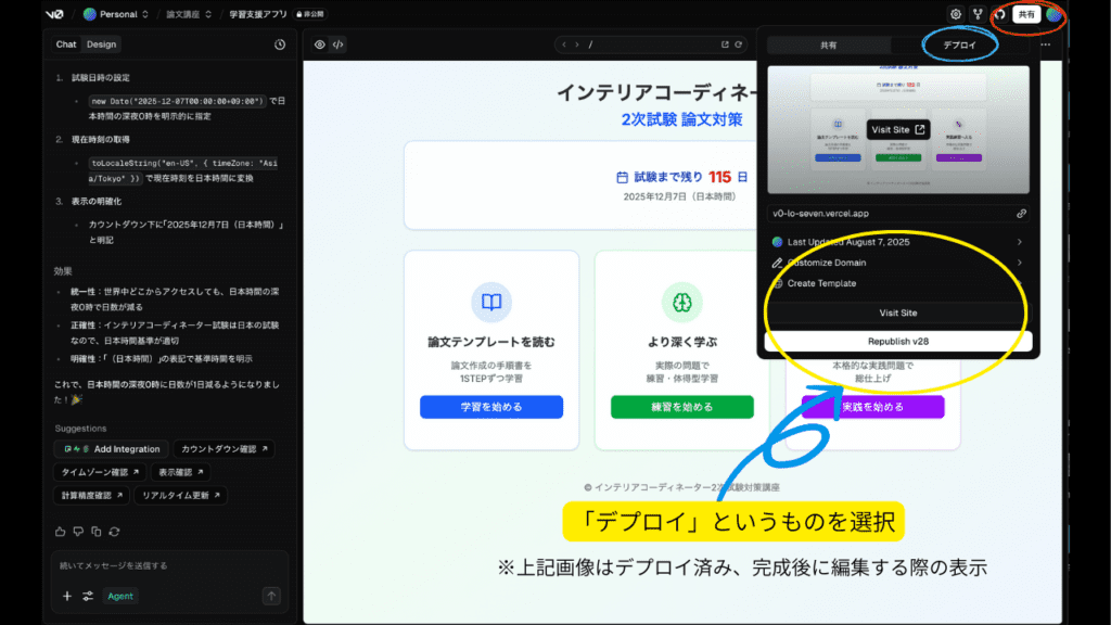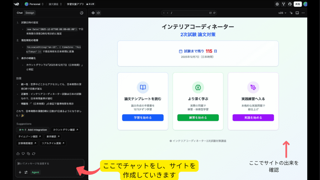 5. 今後もサイトの修正や機能を加える際は、このプロジェクトページへ戻り、サイドバー左の窓にプロンプトを書くと更新ができます。